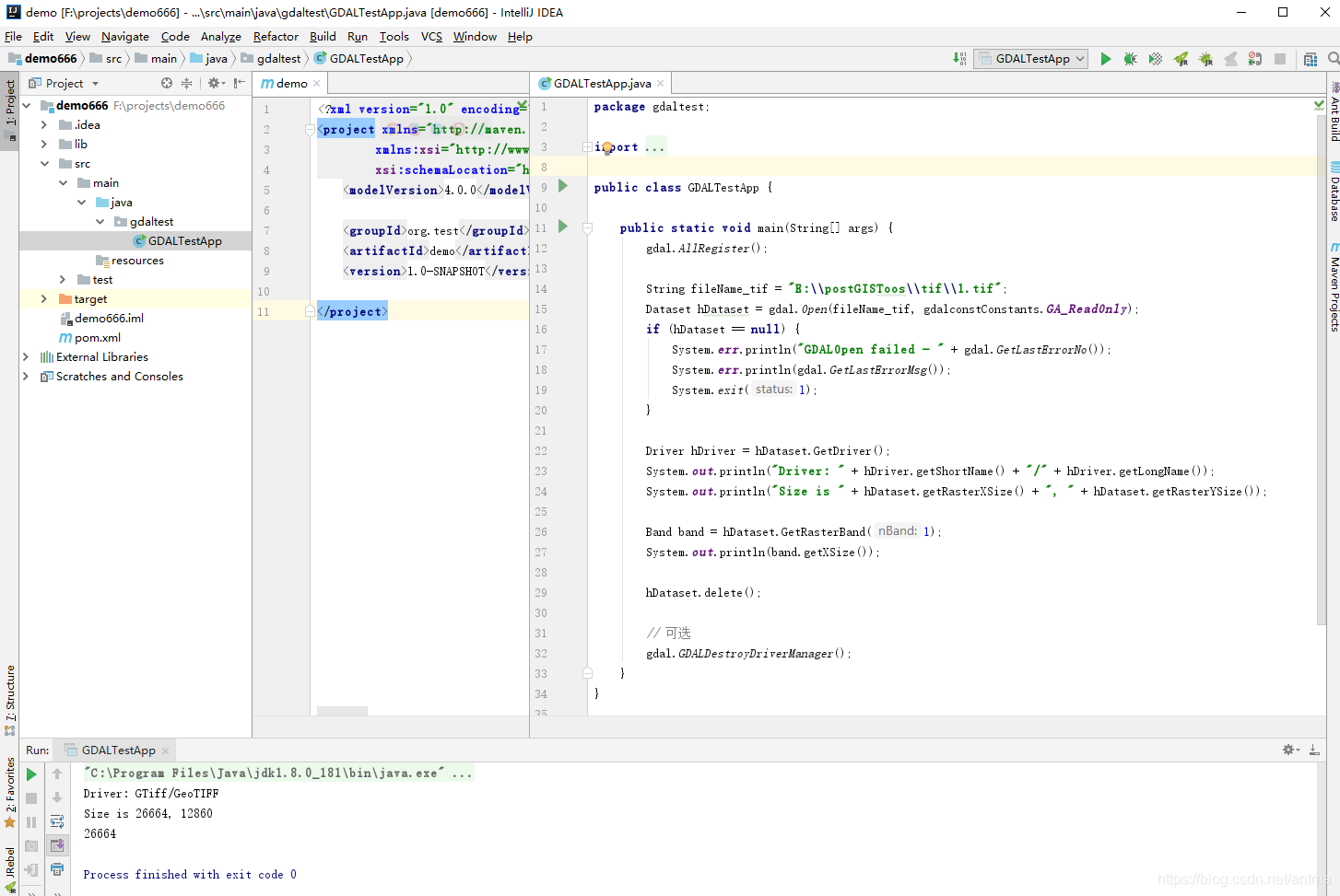 idea 建项目,引用上面的 gdal.jar,添加一个类 GDALTestApp.java ,执行即可拿到 tif 信息: