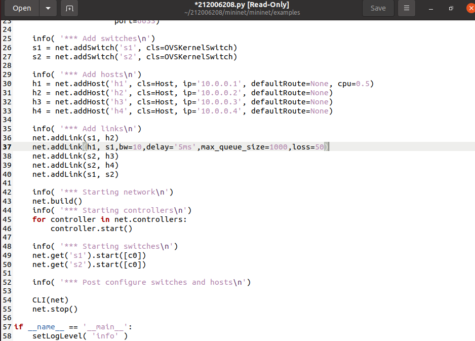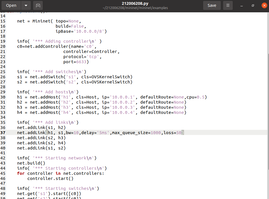 net.addLink(h1, s1,bw=10,delay='5ms',max_queue_size=1000,loss=50)