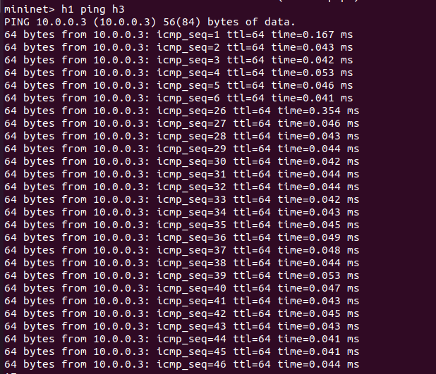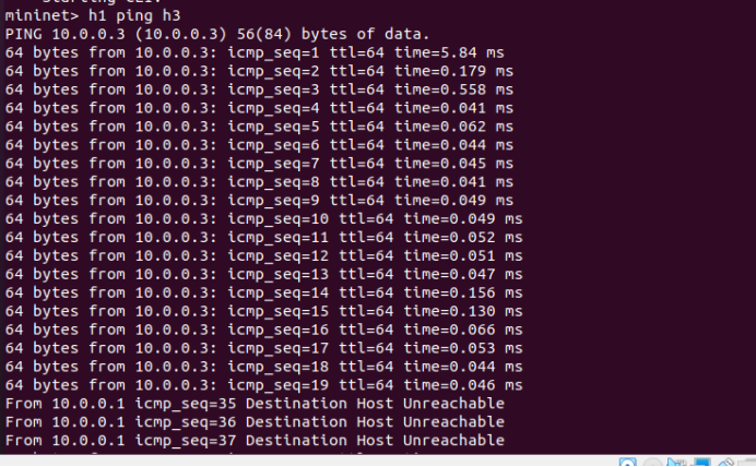 下发硬超时流表,实现拓扑内主机h1和h3网络中断20s。