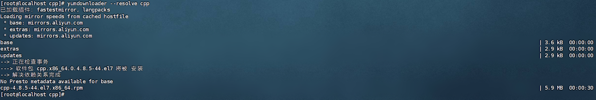 注意: 从本地电脑拷包时,有可能包没下全,我这边本地下的cpp的rpm包大约有6M,但拷到离线服务器的只有896K(可能没下全)导致一直提示安装cpp包失败,排查了好一会以为两台电脑环境不兼容