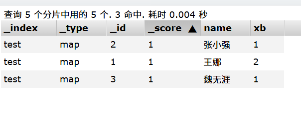 { "code": 200, "message": "执行成功", "data": { "_shards": { "total": 5, "failed": 0, "successful": 5, "skipped": 0 }, "hits": { "hits": [ { "_index": "test", "_type": "map", "_source": { "name": "王娜", "xb": 2 }, "_id": "1", "_score": 0.5753642 } ], "total": 1, "max_score": 0.5753642 }, "took": 2, "timed_out": false } }