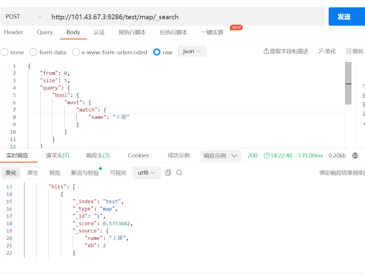 #查询json { "from": 0, "size": 5, "query": { "bool": { "must": { "match": { "name": "王娜" } } } } }