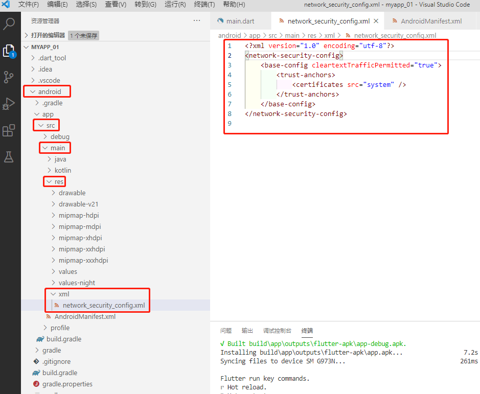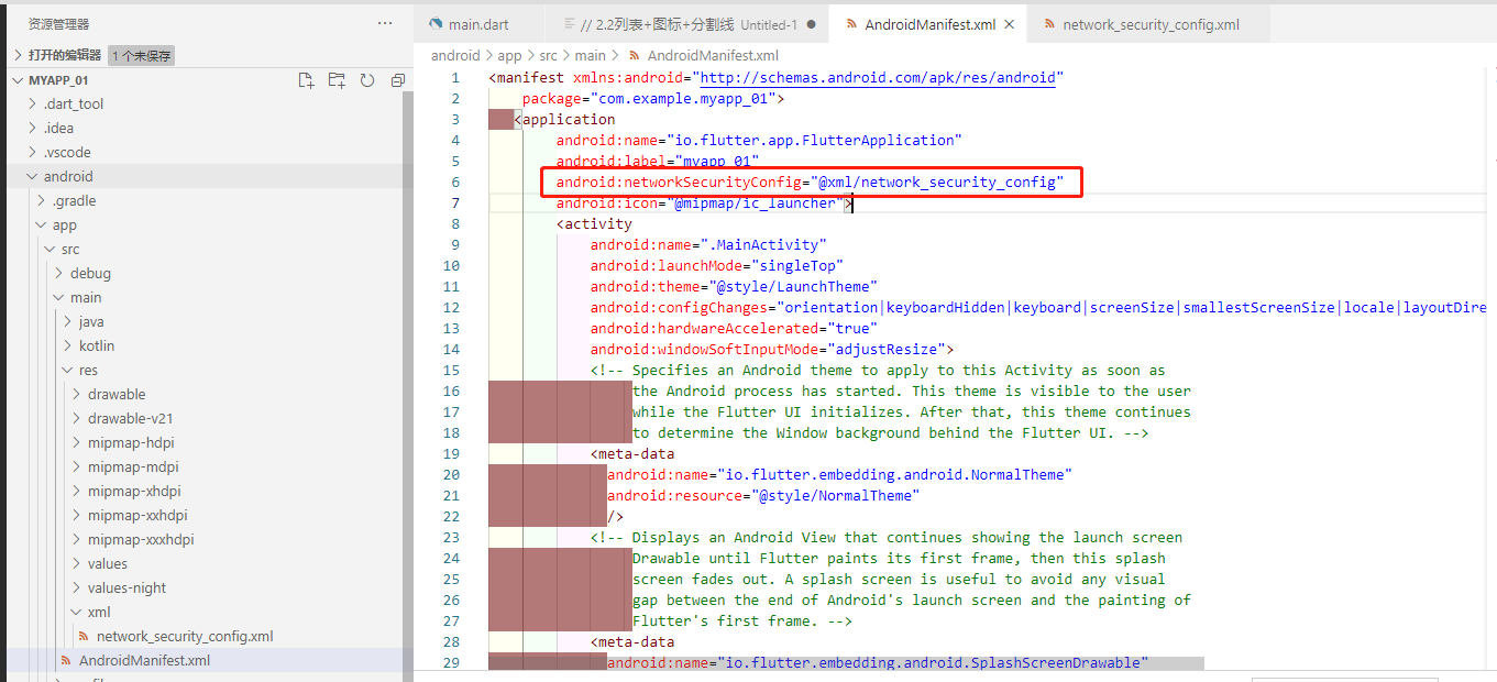 在清单文件\android\app\src\main\AndroidManifest.xml的Application的标签里面设置networkSecurityConfig属性,代码如下: