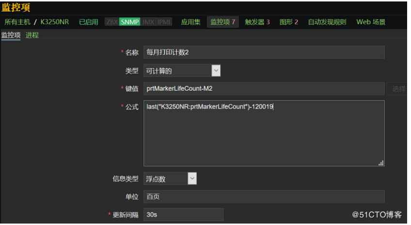 打印机是服务商的,不可能每月都去给你清零,那么只能在zabbix上面动手脚,使用计算公式减掉当前的抄数来达到清零的目的,每个月都这么做也是一种痛苦;