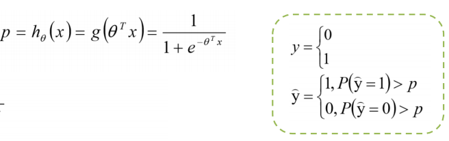 对theta*x进行sigmod激活,转化为概率问题,设置阈值p可将预测结果划分为0、1两类中:
