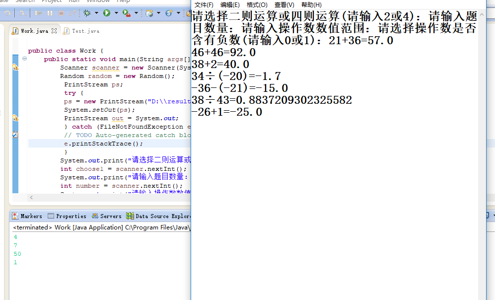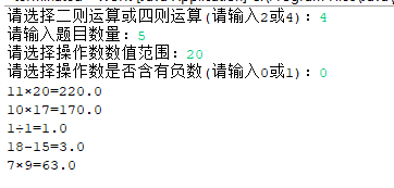 生成两个操作数的算式,题目数量、两则或四则、 操作数数值范围、操作数是否含负数可控,剔除重复算式,生成的运算题存储到外部文件result.txt中。