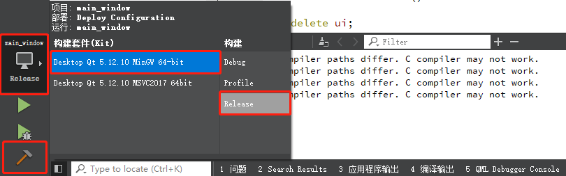 2. 点击左下角 项目——>构建套件(Kit)——>构建,选择Release。
