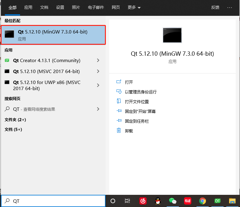 4. Windows10的电脑可以按下Windows + S,然后搜索Qt,会得到一个cmd的图标的文件,点击运行它。