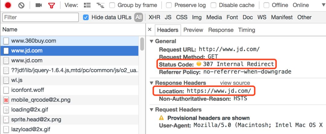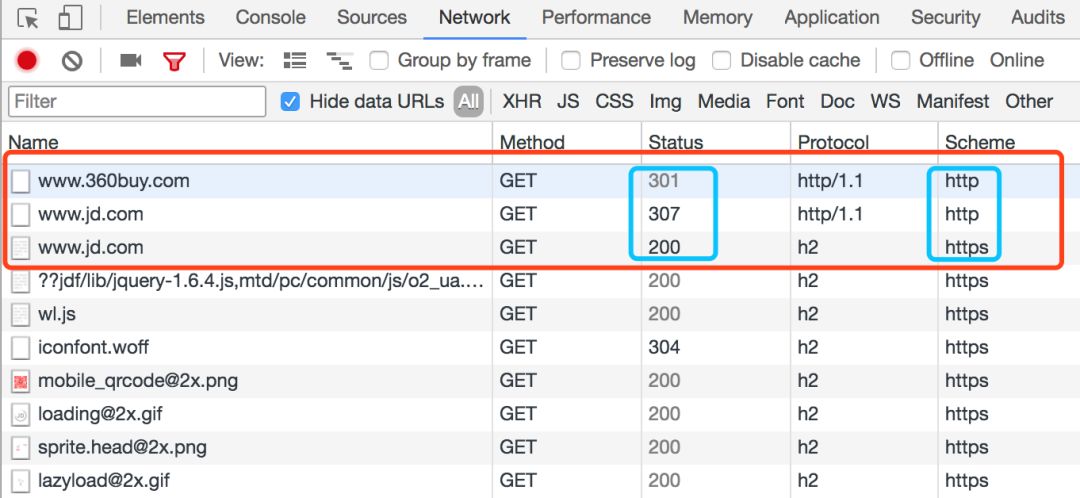 然后第二条发送了www.jd.com的http请求,服务端返回了307状态,表示服务被临时重定向到了www.jd.com。这是为什么呢,怎么重定向到了相同的地址呢?我们仔细看看后面的Scheme列,第三个www.jd.com发送的是一个https,所以它是从http://www.jd.com重定向到了https://www.jd.com。