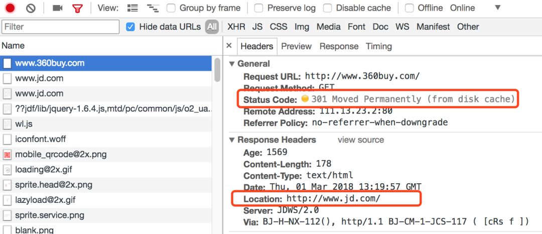 首先看第一条,发送了一个www.360buy.com的http请求,服务端返回了301状态,表示服务端将这个请求永久重定向了www.jd.com新地址。