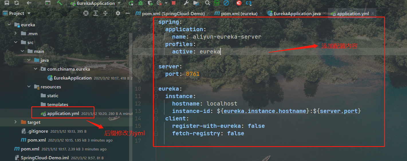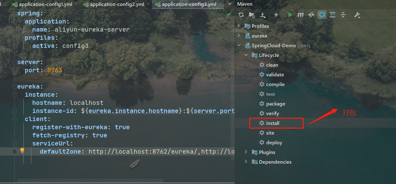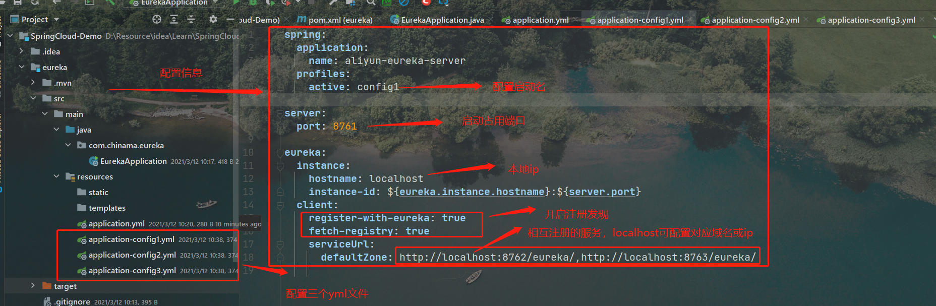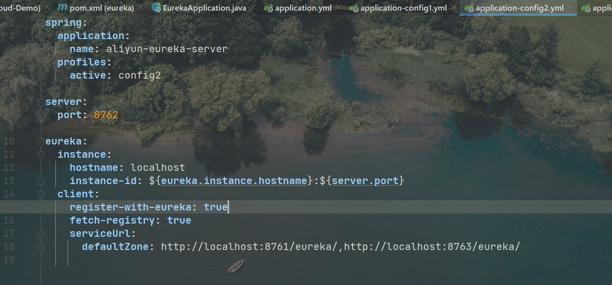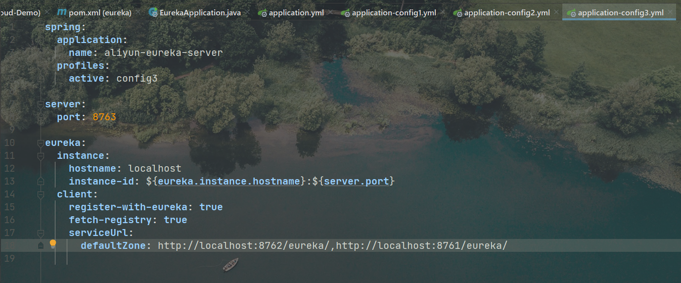 1 spring: 2 application: 3 name: aliyun-eureka-server 4 profiles: 5 active: config1 6 7 server: 8 port: 8761 9 10 eureka: 11 instance: 12 hostname: localhost 13 instance-id: ${eureka.instance.hostname}:${server.port} 14 client: 15 register-with-eureka: true 16 fetch-registry: true 17 serviceUrl: 18 defaultZone: http://localhost:8762/eureka/,http://localhost:8763/eureka/