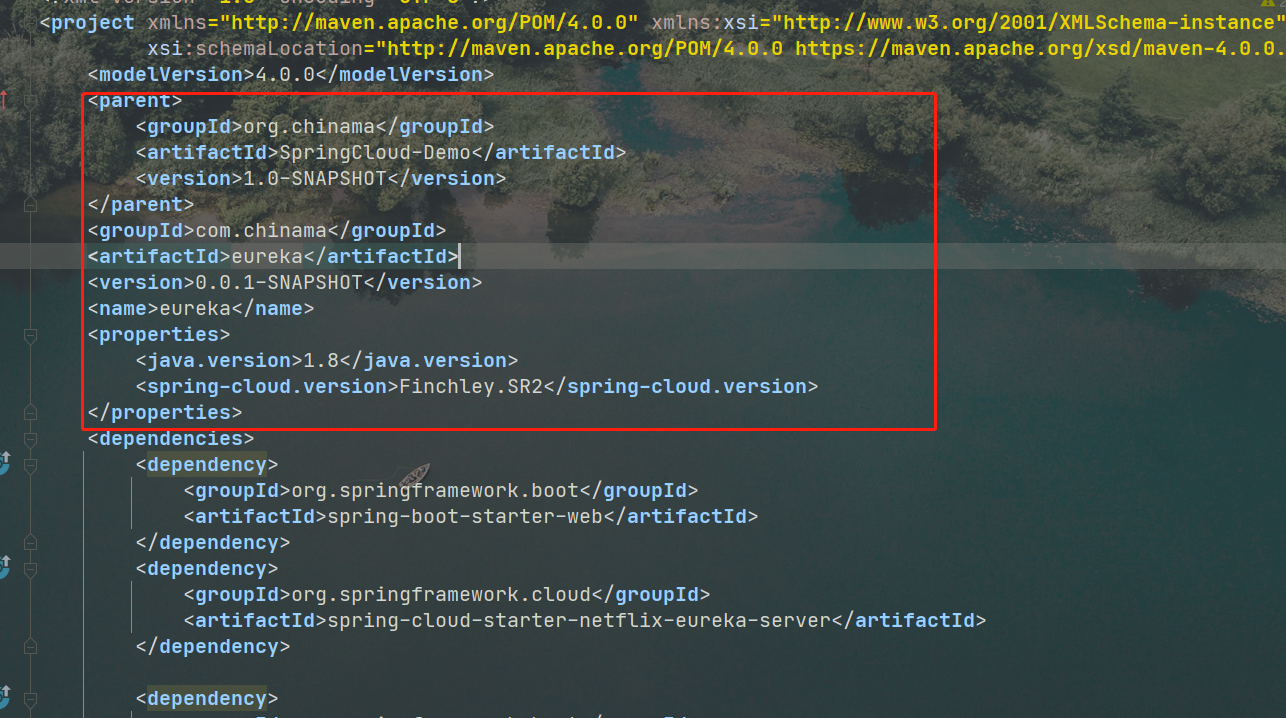 1 <?xml version="1.0" encoding="UTF-8"?> 2 <project xmlns="http://maven.apache.org/POM/4.0.0" xmlns:xsi="http://www.w3.org/2001/XMLSchema-instance" 3 xsi:schemaLocation="http://maven.apache.org/POM/4.0.0 https://maven.apache.org/xsd/maven-4.0.0.xsd"> 4 <modelVersion>4.0.0</modelVersion> 5 <parent> 6 <groupId>org.chinama</groupId> 7 <artifactId>SpringCloud-Demo</artifactId> 8 <version>1.0-SNAPSHOT</version> 9 </parent> 10 <groupId>com.chinama</groupId> 11 <artifactId>eureka</artifactId> 12 <version>0.0.1-SNAPSHOT</version> 13 <name>eureka</name> 14 <properties> 15 <java.version>1.8</java.version> 16 <spring-cloud.version>Finchley.SR2</spring-cloud.version> 17 </properties> 18 <dependencies> 19 <dependency> 20 <groupId>org.springframework.boot</groupId> 21 <artifactId>spring-boot-starter-web</artifactId> 22 </dependency> 23 <dependency> 24 <groupId>org.springframework.cloud</groupId> 25 <artifactId>spring-cloud-starter-netflix-eureka-server</artifactId> 26 </dependency> 27 28 <dependency> 29 <groupId>org.springframework.boot</groupId> 30 <artifactId>spring-boot-starter-test</artifactId> 31 <scope>test</scope> 32 </dependency> 33 </dependencies> 34 <dependencyManagement> 35 <dependencies> 36 <dependency> 37 <groupId>org.springframework.cloud</groupId> 38 <artifactId>spring-cloud-dependencies</artifactId> 39 <version>${spring-cloud.version}</version> 40 <type>pom</type> 41 <scope>import</scope> 42 </dependency> 43 </dependencies> 44 </dependencyManagement> 45 46 <build> 47 <plugins> 48 <plugin> 49 <groupId>org.springframework.boot</groupId> 50 <artifactId>spring-boot-maven-plugin</artifactId> 51 </plugin> 52 </plugins> 53 </build> 54 55 </project>