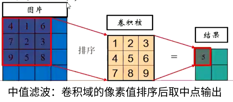 TEST_CASE("test_opencv_卷积核测试_002_中值滤波MedianFilter", "[test_opencv_convolution_kenels]") { Mat img, img_gray, result; Mat clahe_result; img = imread(test_opencv_convolution_kenels::imagePath); int wid = img.cols*0.2, hei = img.rows*0.2; resize(img, img, cv::Size(wid, hei)); cvtColor(img, img_gray, cv::COLOR_BGR2GRAY); for (int i=0; i+10<img_gray.cols; i+=10) { // 撒上椒盐噪声 for (int j=0; j+10<img_gray.rows; j+=10) { if (i < img_gray.rows && j < img_gray.cols) img_gray.at<uchar>(i, j) = 0; } } cv::Mat img_median; /* 中值滤波 : 卷积域的像素值排序后取中间值输出为新像素 优点 : 有效去除椒盐噪声 */ cv::medianBlur(img_gray, img_median, 3/*模糊核的线性大小3,5,7...*/); imshow("灰度图src", img_gray); imshow("经过medianBlur中值滤波后", img_median); waitKey(); }
