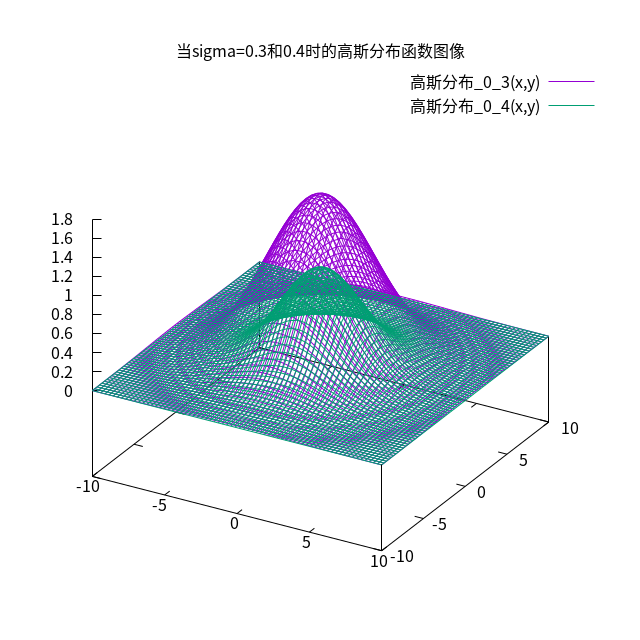 高斯分布公式:\(G_\sigma={\frac{1}{2*\pi*\sigma^2}}*e^{-\frac{x^2+y^2}{2*\sigma^2}}\),入参\(\sigma\)标准差,标准差增大,图像变矮