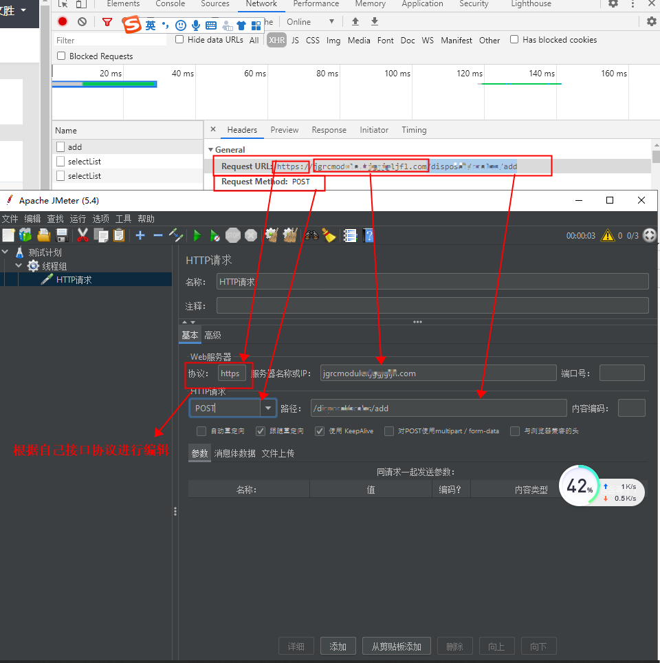 第四步:点击页面调试器(以谷歌浏览器为例F12)填写协议,IP,请求,路径