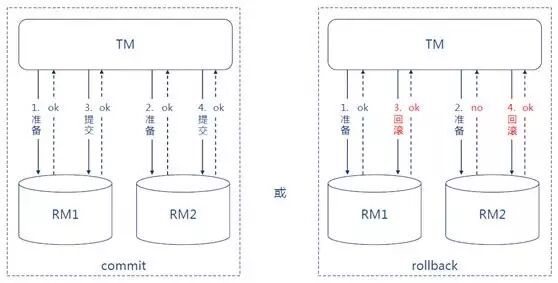 订单服务不能直接访问客户表,只能通过客户服务发布的API来访问或者使用分布式事务, 也就是众所周知的两阶段提交 (2PC)来访问客户表,2PC意义图如下所示: