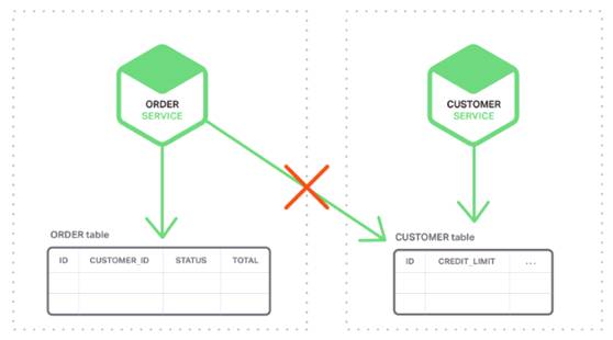 相反微服务架构下,订单和客户表分别是相应服务的私有表,如下图所示: