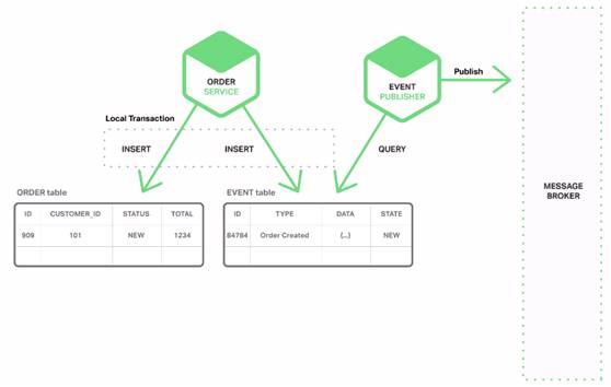 获得原子性的一个方法是将服务的业务操作和发布事件放在一个本地数据库事务里,也就是说,需要在本地建立一个EVENT表,此表在存储业务实体数据库中起到消息列表功能。当应用发起一个(本地)数据库交易,更新业务实体状态时,会向EVENT表中插入一个事件,然后提交此次交易。另外一个独立应用进程或者线程查询此EVENT表,向消息代理发布事件,然后使用本地交易标志此事件为已发布,如下图所示: