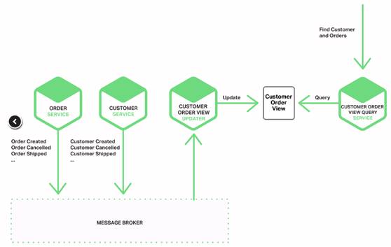 例如上图中间的 “客户订单视图更新”服务,主要负责客户订单视图的更新。该服务订阅了客户服务和订单服务发布的事件。当“客户订单视图更新”服务收到了上图左侧的客户或者订单更新事件,则会触发更新客户订单物化视图数据集。这里可以使用文档数据库(例如MongoDB)来实现客户订单视图,为每个用户存储一个文档。而上图右侧的客户订单视图查询服务负责响应对客户以及最近订单(通过查询客户订单视图数据集)的查询。