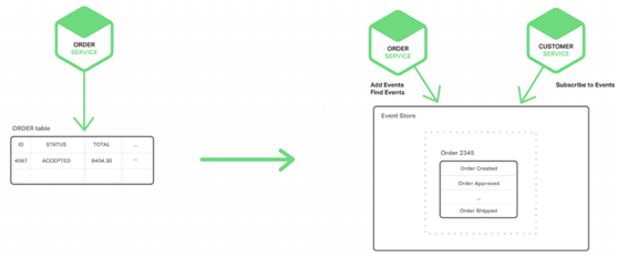 为了理解事件源工作方式,考虑以事件实体作为一个例子说明。传统方式中,每个订单映射为ORDER表中一行。但是对于事件源方式,订单服务以事件状态改变方式存储一个订单:创建的,已批准的,已发货的,取消的;每个事件包括足够信息来重建订单的状态。