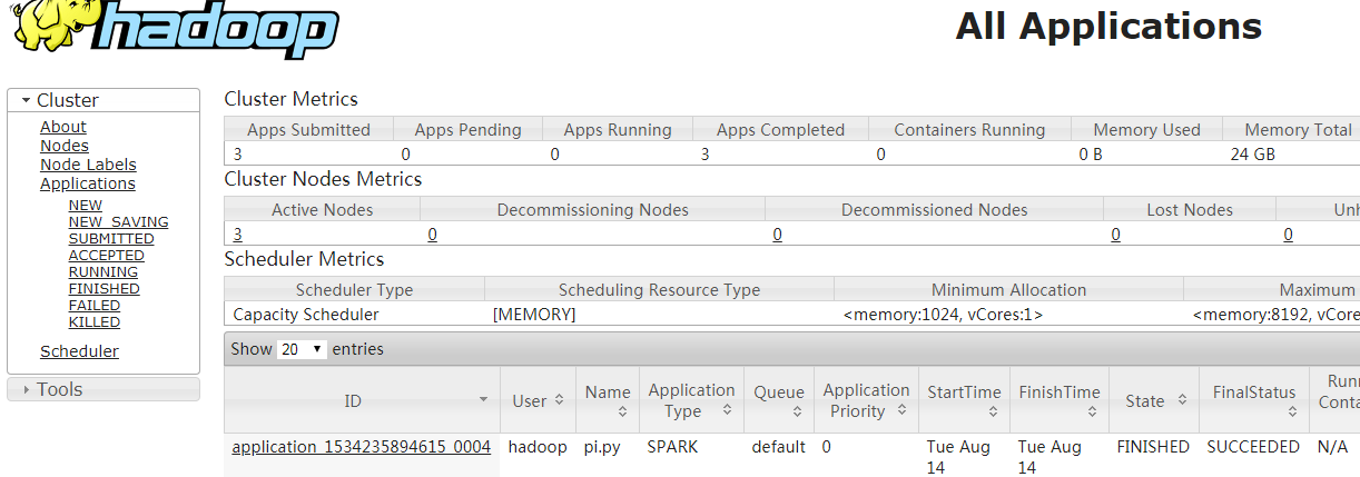 yarn资源查看http://192.168.74.131:8088/cluster,这里的端口是hadoop的yarn-site.xml中的端口配置