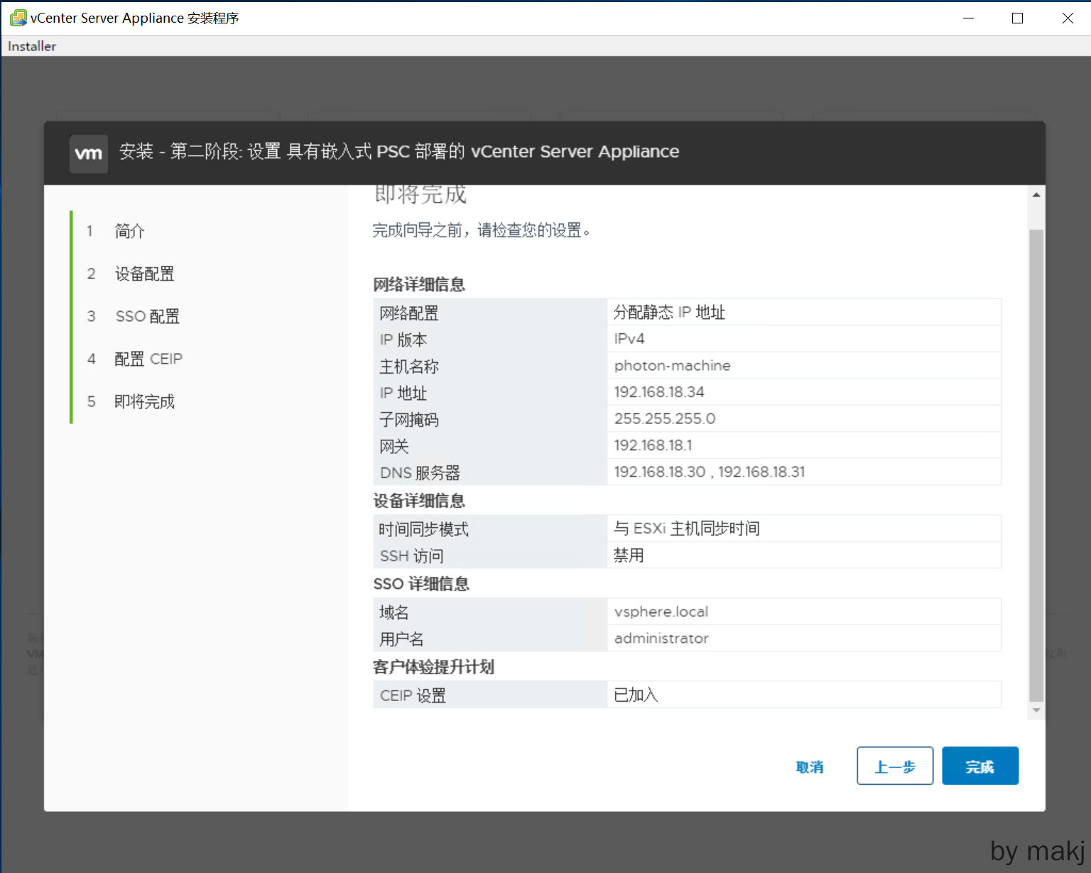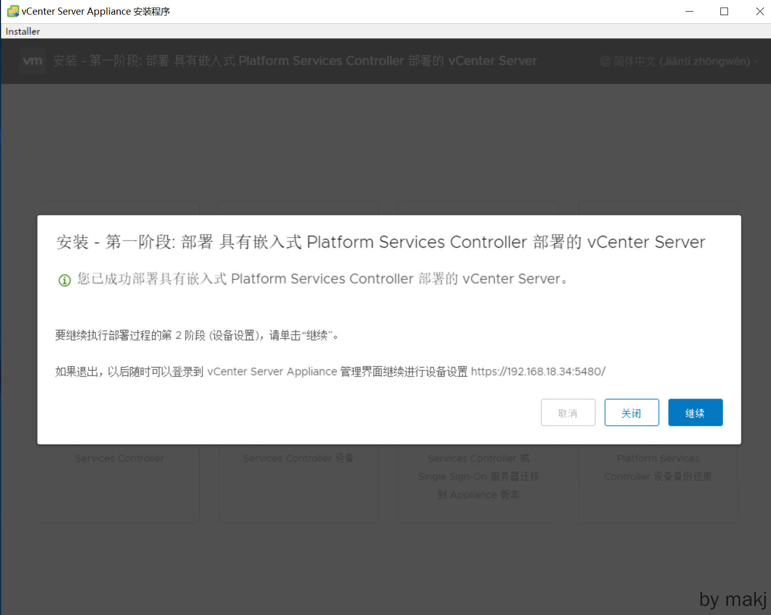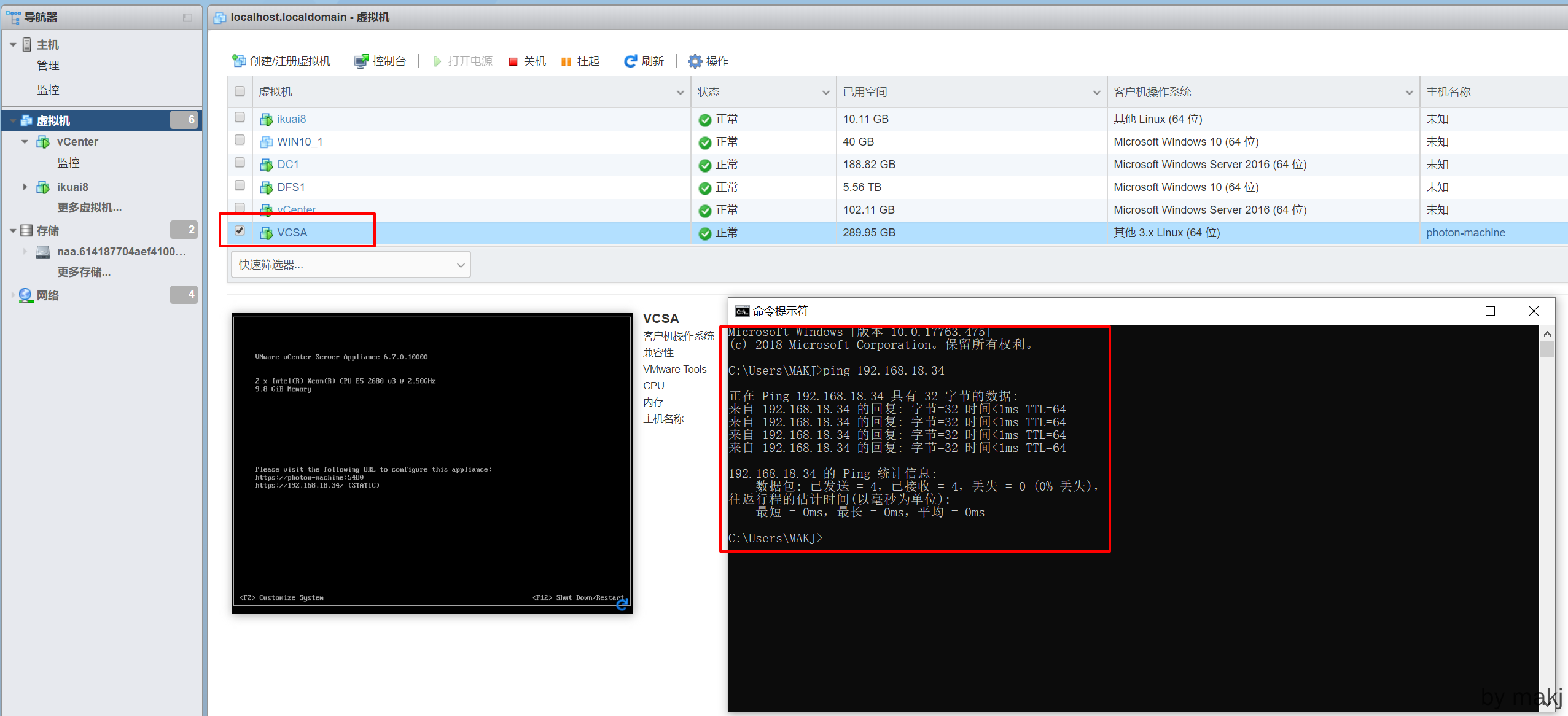 安装完成后,IP可以ping通,ESXI主机上会多一个VCSA的虚拟机。