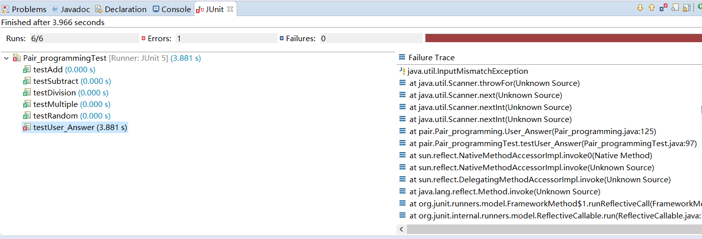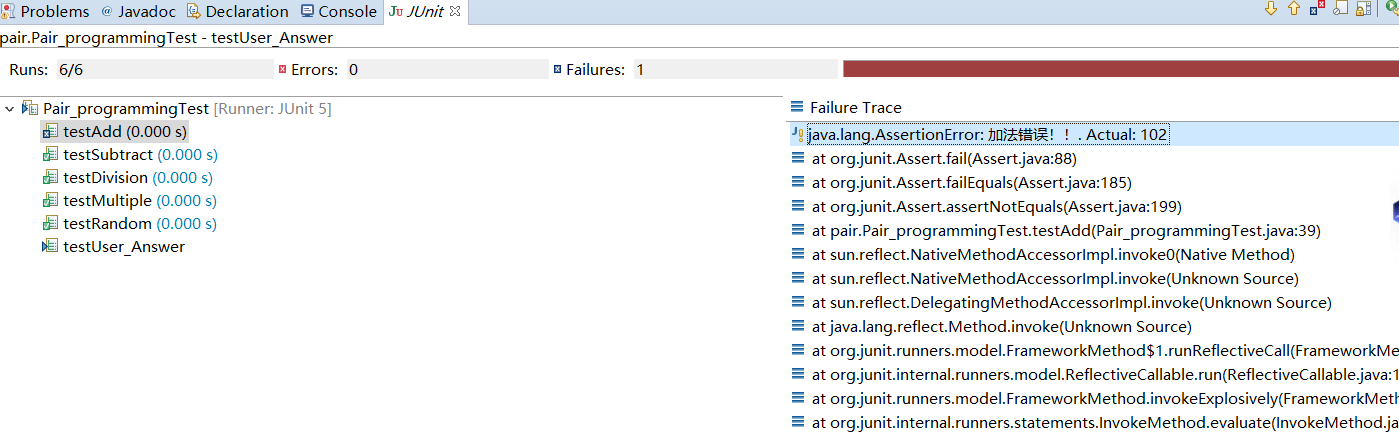 import static org.junit.Assert.*;import org.junit.After;import org.junit.Before;import org.junit.Test;public class Pair_programmingTest { public static Pair_programming Pair_Test = new Pair_programming() ; @Before public void setUp() throws Exception { } @After public void tearDown() throws Exception { } @Test public void testRandom() { int left, right, operator ; Pair_Test.random() ; left = Pair_Test.Getleft() ; right = Pair_Test.Getright() ; operator = Pair_Test.Getoperator() ; assertFalse("随机数产生错误!!", left < 0 || left > 100 || right < 0 || right > 100 || operator < 0 || operator > 3 ) ; } @Test public void testAdd() { int answer ; answer = Pair_Test.add(5, 20) ; assertEquals("加法错误!!", 25, answer) ; answer = Pair_Test.add(30, 40) ; assertEquals("加法错误!!", 70, answer) ; answer = Pair_Test.add(49, 51) ; assertEquals("加法错误!!", 100, answer); answer = Pair_Test.add(50, 52) ; assertNotEquals("加法错误!!", 102, answer); } @Test public void testSubtract() { int answer ; answer = Pair_Test.subtract(50, 20) ; assertEquals("减法错误!!", 30, answer) ; answer = Pair_Test.subtract(70, 10) ; assertEquals("减法错误!!", 60, answer) ; answer = Pair_Test.subtract(60, 60) ; assertEquals("减法错误!!", 0, answer) ; answer = Pair_Test.subtract(50, 100) ; assertTrue("减法错误!!", answer > 0) ; } @Test public void testMultiple() { int answer ; answer = Pair_Test.multiple(3, 10) ; assertEquals("乘法错误!!", 30, answer) ; answer = Pair_Test.multiple(25, 3) ; assertEquals("乘法错误!!", 75, answer) ; answer = Pair_Test.multiple(10, 10) ; assertEquals("乘法错误!!", 100, answer) ; answer = Pair_Test.multiple(50, 100) ; assertTrue("乘法错误!!", answer <= 100) ; } @Test public void testDivision() { int left, right, answer ; answer = Pair_Test.division(20, 5) ; assertEquals("除法错误!!", 4, answer) ; answer = Pair_Test.division(27, 3) ; assertEquals("除法错误!!", 9, answer) ; answer = Pair_Test.division(30, 9) ; left = Pair_Test.Getleft(); right = Pair_Test.Getright(); if(left/right != 3) { assertTrue("除法错误!!", answer != 3); } answer = Pair_Test.division(71, 30) ; left = Pair_Test.Getleft(); right = Pair_Test.Getright(); if(left/right != 2) { assertTrue("除法错误!!", answer != 2); } answer = Pair_Test.division(40, 0) ; } @Test public void testUser_Answer() { // 尝试输入字符或小于0的数 assertFalse("请输入大于0的答案", Pair_Test.User_Answer() < 0) ; }} |