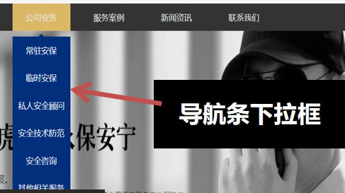 <li class="yewu"><a href="business.html">公司业务</a> <div class="nav2"> <div class="dropDown-C"></div> <div class="dropDown-B"></div> <a href="">常驻安保</a> <a href="">临时安保</a> <a href="">私人安全顾问</a> <a href="">安全技术防范</a> <a href="">安全咨询</a> <a href="">其他相关服务</a> </div></li>
