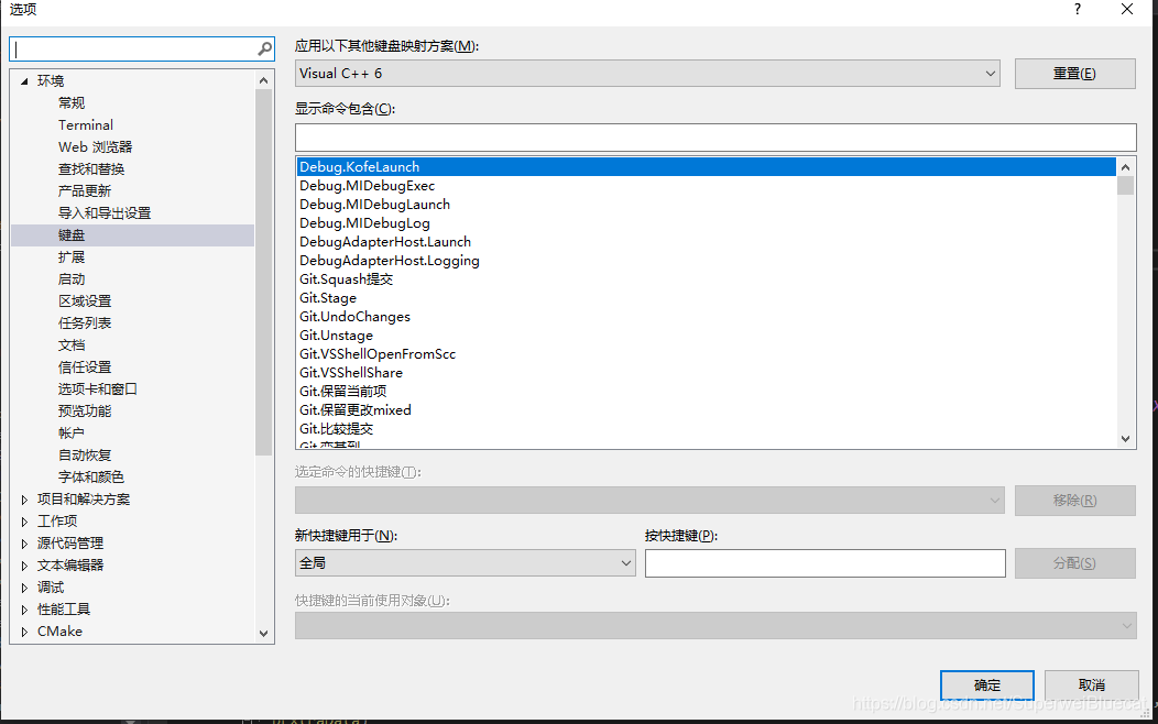 首先打开VS的选项页面找到标签页"环境"->"键盘", 此处是设置快捷键的设置地方。 如图