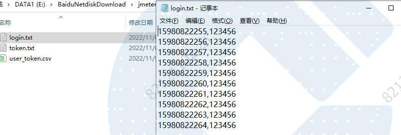 我们希望能批量登录用户,先提取注册准备好一批账号和密码,用 login.txt 保存账号和密码,格式如下