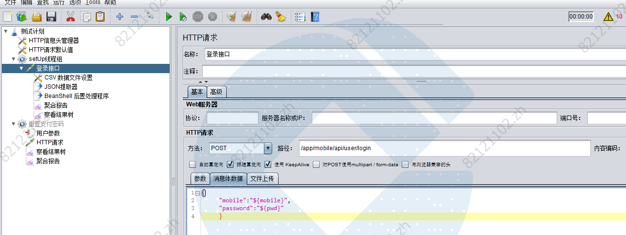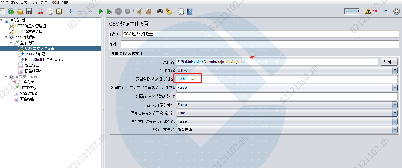 添加配置元件- CSV 数据文件设置,引用参数化文件,并设置2个变量mobile,pwd(变量中间英文逗号隔开)