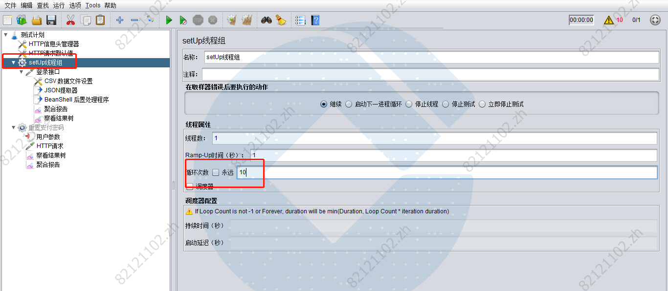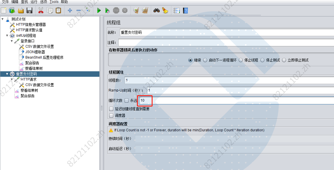 这里有10个账号,在线程组里面设置循环10次,让用户循环使用里面的账号和密码去登录