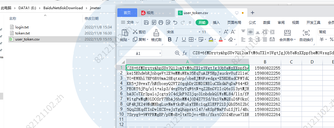 保存到本地E:\\BaiduNetdiskDownload\\jmeter\\user_token.csv,同时保存了mobile和对应的token值,相关代码如下