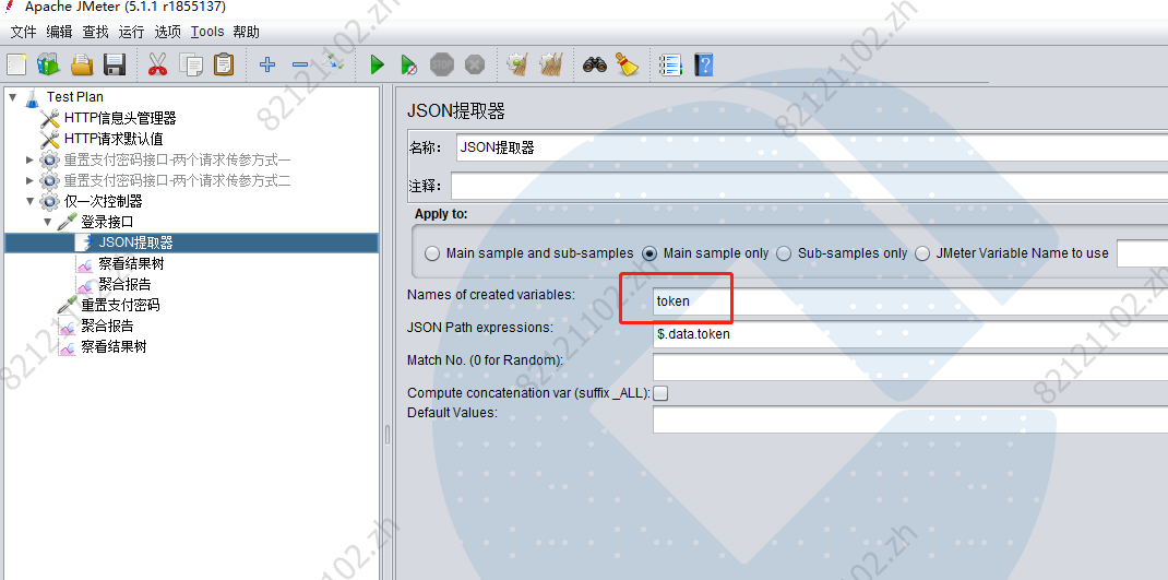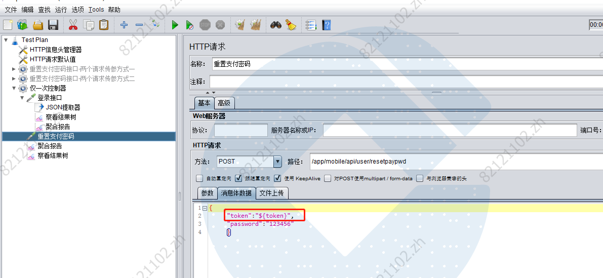 线程组添加2个接口,一个是登陆的提取出token,另外一个是重置支付密码依赖登陆的token