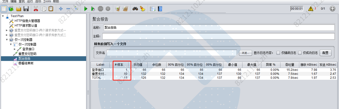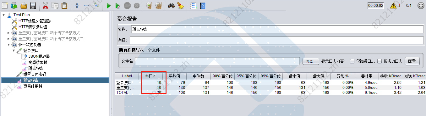 当设置一个线程时,循环10次,运行后查看聚合报告,登陆也执行了10次。