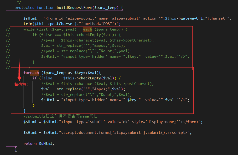 五、复制alipay/pagepay里面的pagepay.php代码到自己的支付方法里面需要修改(发生错误的顺序没分先后)