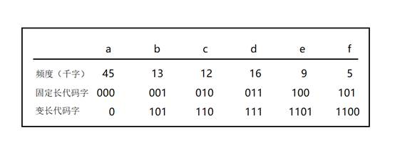 可以用很多种方式来表示这样一个文件。我们来考虑设计一种二进制字符编码(或简称为编码)的问题,其中每一个字符都由唯一的二进制串来表示。如果采用固定长度编码,则需要三位二进制数字来表示六个字符:a=000, b=001,…,f=101,这种方法需要300 000位来对整个原文件编码,这是一种固定长度编码。
