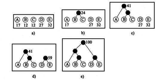 一旦建立了各个字符的权值后,就可以根据这些值构造一棵树。构造树的过程如图2所示。它遵循以下三个基本步骤: