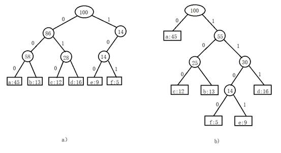 解码过程需要有一种关于前缀编码的方便表示,使得初始编码可以很容易地被识别出来。有一种表示方法就是叶子为给定字符的二叉树。在这种树中,我们将一个字符的编码解释为从根至该字符的路径,其中0表示“转向左子结点”,1表示“转向右子结点”。图3给出了与我们的例子中两种编码对应的二叉树。注意它们并不是二叉查找树,因为各叶结点无需以排序次序出现,且内结点也不包含关键字。