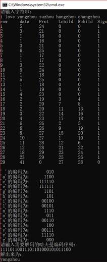 子模块三:哈夫曼树建立、存储与打印模块。它们能根据各个字符的权重建立一棵哈夫曼树,并打印哈夫曼树的顺序存储结构。