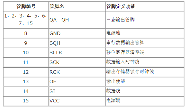 QA--QH: 八位并行输出端,可以直接控制数码管的8个段。