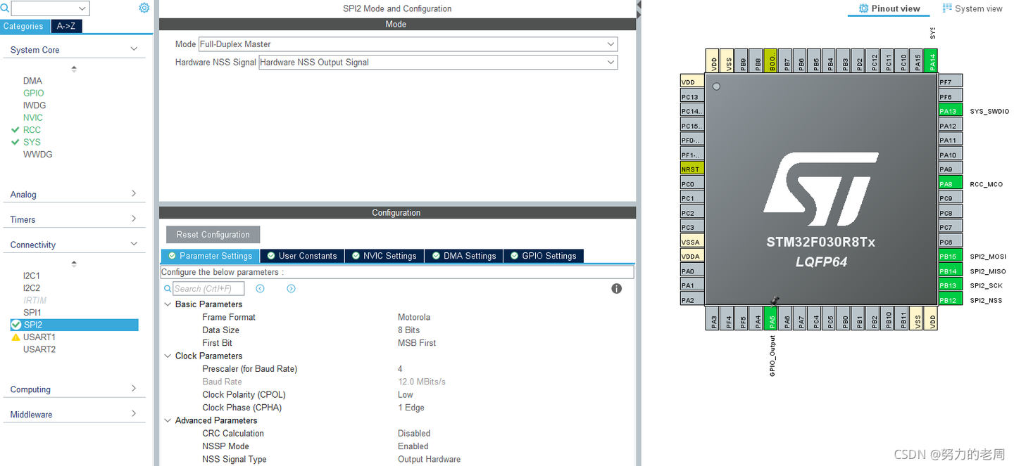 STM32F030有两路硬件SPI,都可以使用。这里我配置了SPI2。详细配置如下图: