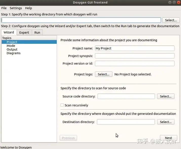 安装完成后在命令行输入doxygen,如果出现帮助信息,说明安装成功,如果出现command not font则表明安装失败。之后使用sudo apt-get install doxygen-gui安装gui,就可以像windows那样使用图形化操作了。安装完成后使用doxygenwizard命令就可以打开doxygen了。