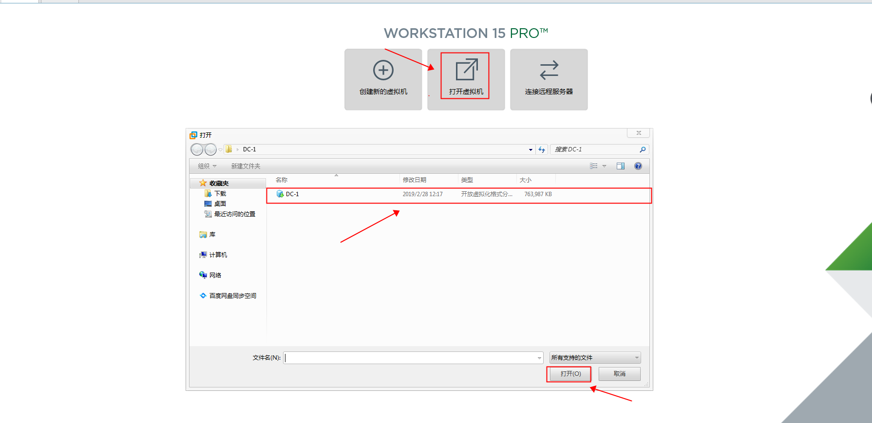 第二步:在虚拟机这边新建页面选择“打开虚拟机”,选择下载好的DC-1程序包,再点击打开