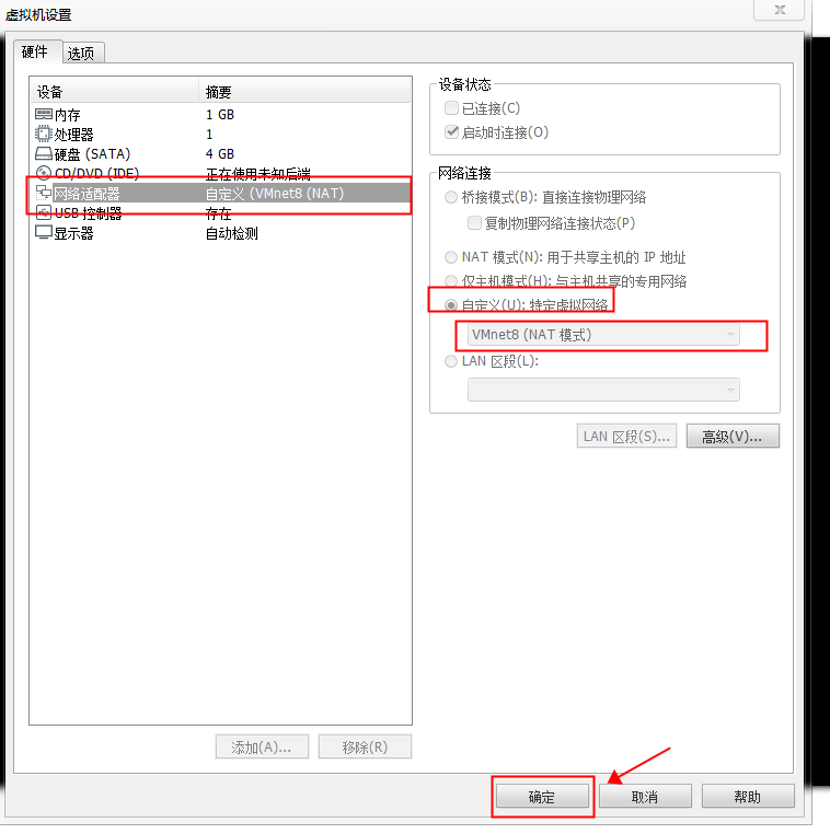 第四步:然后选择“网络适配器”,自定义为Vmnet8(NAT模式),点击确定。