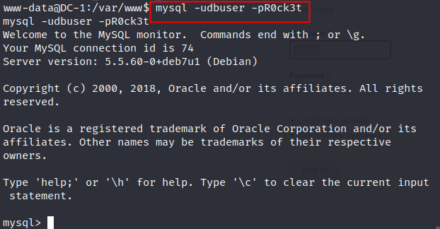 mysql -udbuser -pR0ck3t //登录数据库 -u是username, -p是password