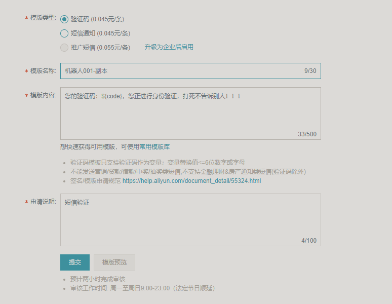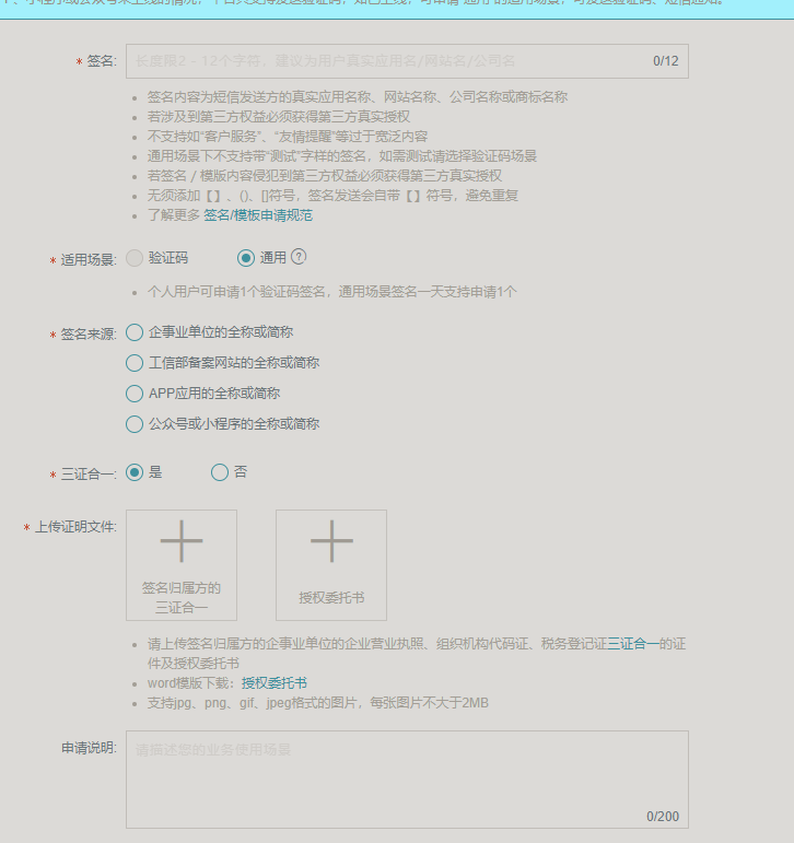 - 签名内容为短信发送方的真实应用名称、网站名称、公司名称或商标名称