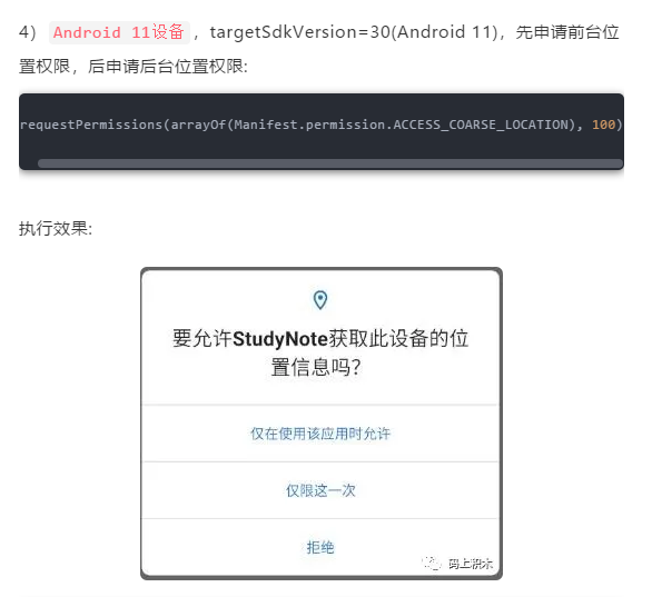(ACCESS_BACKGROUND_LOCATION),并选择Allow all the time (始终允许)才能获得后台位置权限。Android 11 设备上再次加强对后台权限的管理,主要表现在系统对话框上,对话框不再提示始终允许字样,而是提供了位置权限的设置入口,需要在设置页面选择始终允许才能获得后台位置权限。 -