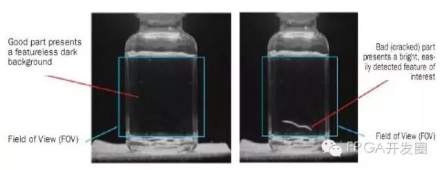 在这个应用当中,用暗场照明来创立一个明亮的,在暗背景下容易检测的感兴趣特征。在一个暗场区域中光线直接通过透明的瓶子。大多数穿透透明对象的光线不会被相机检测到。如果材料不规则,比如有裂纹,一些光线就会凸显出这个不规则。特别是划痕创立了一个内部空缺,这里光线折射和反射,以许多角度散射包括返回给相机。这些光线将很难检测的划痕转换到暗背景下的亮特征。