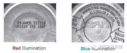 在机器视觉应用中创造一个高对比度图像的一个有用的方法是用特殊波长(彩色)的光照明物体。对于黑白相机来讲,光的波长能使得跟彩色一样的特征变亮或变暗。使用彩色轮子作为参考,选择一个相反颜色的光来使得特征变暗;或选相同颜色的光使得特征变亮。例如:
